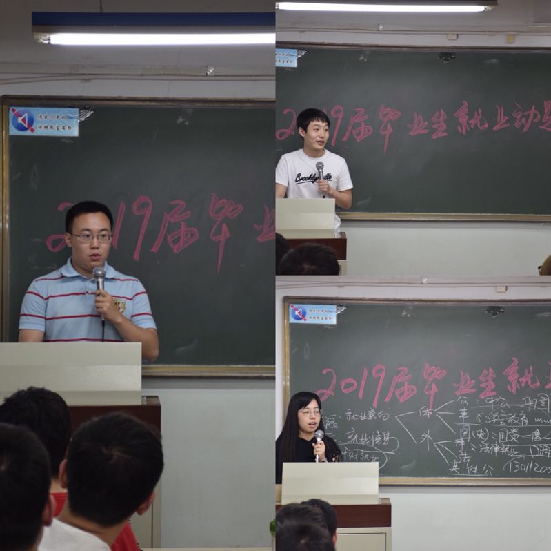2018年5月30日晚上7点半,永利官网于学院南路主教519教室为2019届毕业生举行了“学长学姐为你导航”系列活动之就业经验分享会。会议由永利官网党委副书记徐颖老师主持,主讲人为2015级法学研班的宋亦淼、党弘毅,2016级法律硕士(法学)班的侯圣博和2015级法律硕士(非法学)班的陈雨曦四位同学。研究生辅导员蒙广平老师全程参加了该会议。