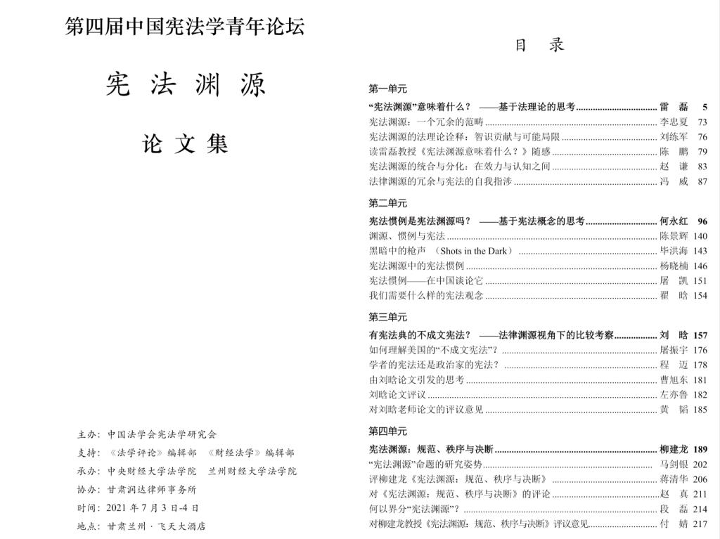 2021年7月3日至4日,由中国法学会宪法学研究会主办,永利集团88304官网、兰州财经大学永利集团88304官网承办的第四届中国宪法学青年论坛在甘肃兰州举行。本次论坛的主题为“宪法渊源”。
