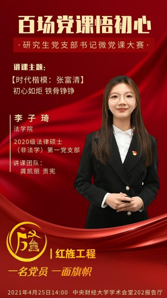为深入学习贯彻习近平新时代中国特色社会主义思想,迎接中国共产党百年华诞,在全体研究生党员中扎实推动党史学习教育,永利集团88304官网党委研究生工作部、研究生院举办党史学习教育专题培训暨红旌工程“百场党课悟初心”研究生党支部书记微党课大赛。永利官网2020级法律硕士(非法学)第一党支部书记李子琦荣获一等奖。